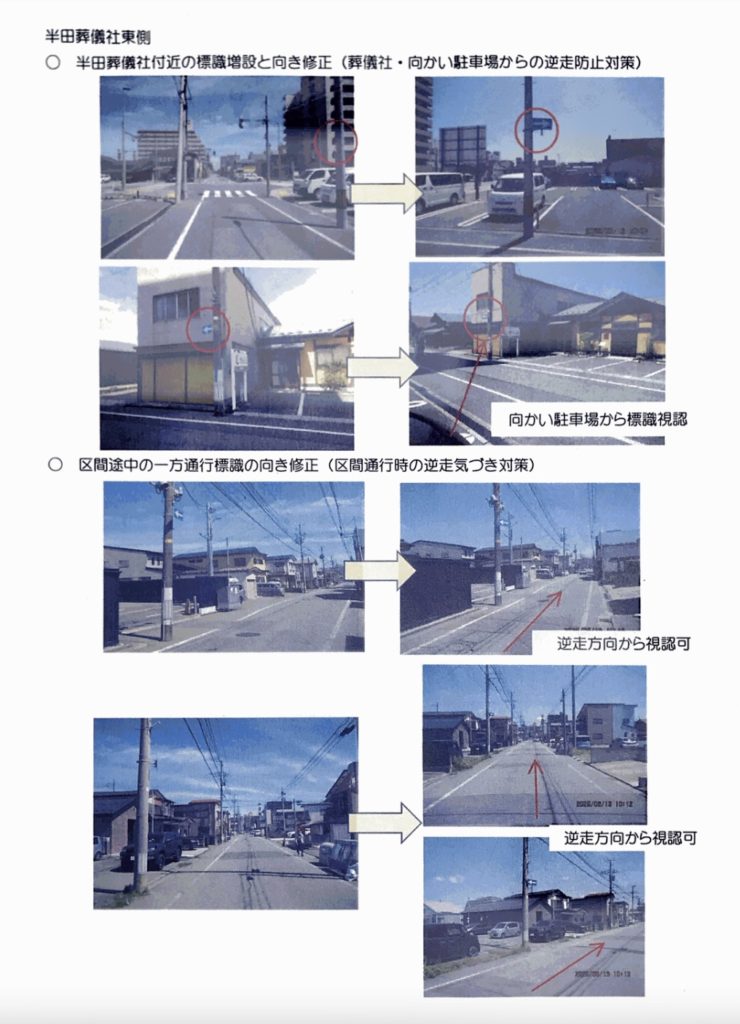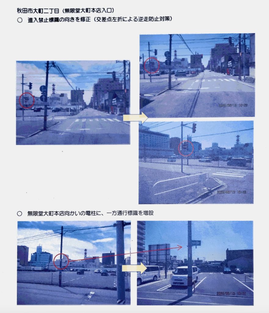 先日、逆走された箇所について秋田県警察本部に相談したところ、防止対策として、入り口に目立つように一方通行看板を設置し、看板の位置変え、角度変えなどの対応いただきました。