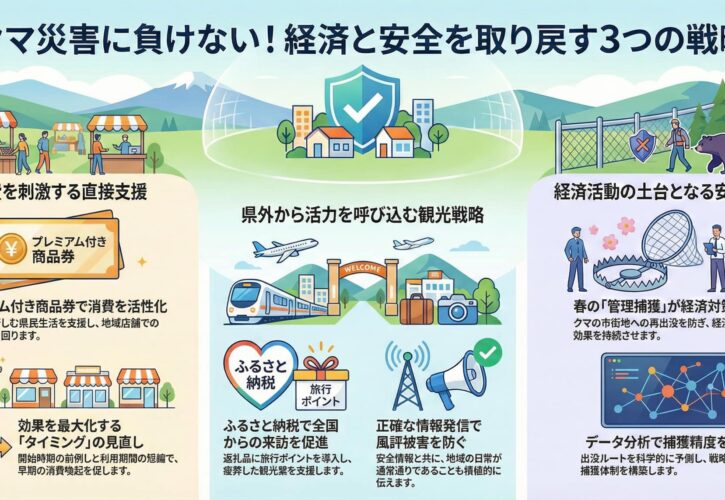 来年春、県はクマの管理捕獲を行います。そして、管理捕獲の精度を高めていくことが重要です。そのためには、より精緻な頭数把握と目標設定、計画的な捕獲体制、戦略的な捕獲と管理の徹底が必要です。そうしないと、商品券やふるさと納税などの経済対策も台無しになりかねません。
