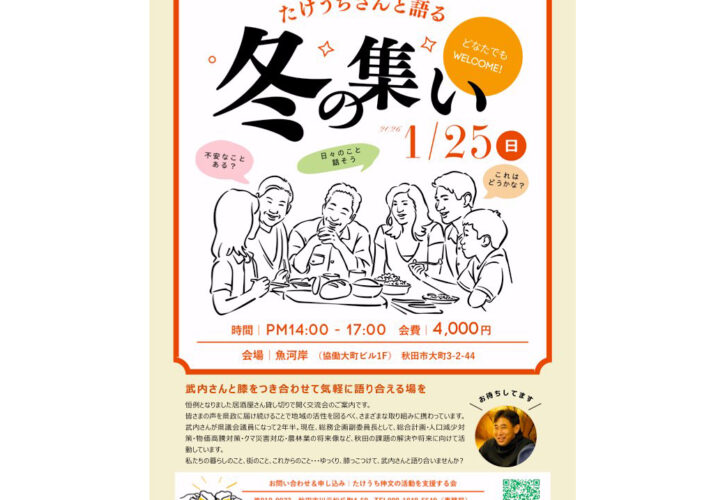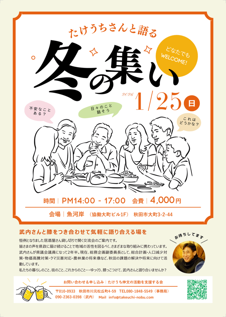 また、年明けには、恒例となりました居酒屋さんを貸切りで開く「たけうちさんと語る冬の集い」を開催します。