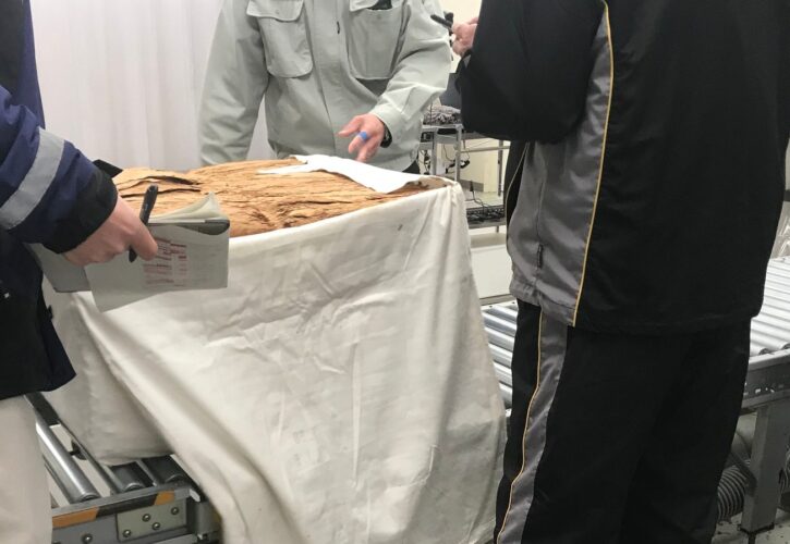 この時期、北東北で生産・収穫された葉たばこがリーフセンターに集められ、重量、葉の色、大きさ、水分量など様々な項目で格付け評価され、葉たばこの品質確保、生産者への適正な支払いにつながる仕組みとなっています。