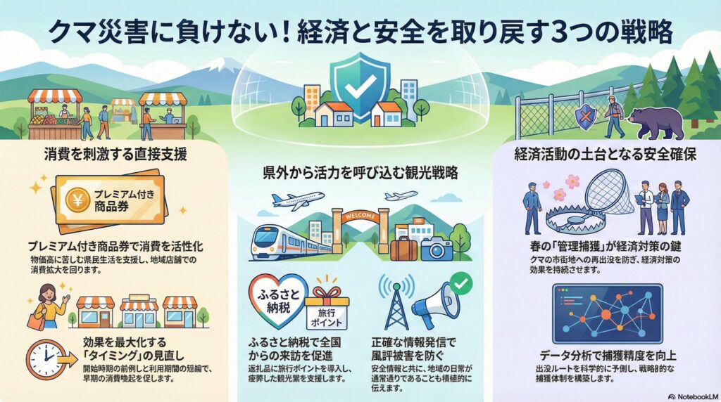 私からは、クマ災害に対応した経済対策「プレミアム付き商品券」「ふるさと納税による旅行ポイント」「クマの管理捕獲」についてお話しさせていただきました。