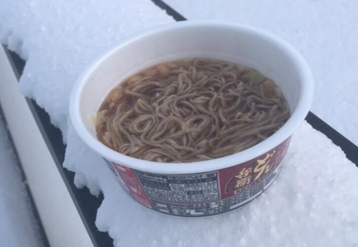 晴れ間が見えたかと思えば、突然の吹雪、目まぐるしく変わる天候の中、休憩で身体を温めるヌードル作戦は、鈴木知事から教えてもらったもの。今年は年越しそばを食べそこねたため鴨そばをいただきました。